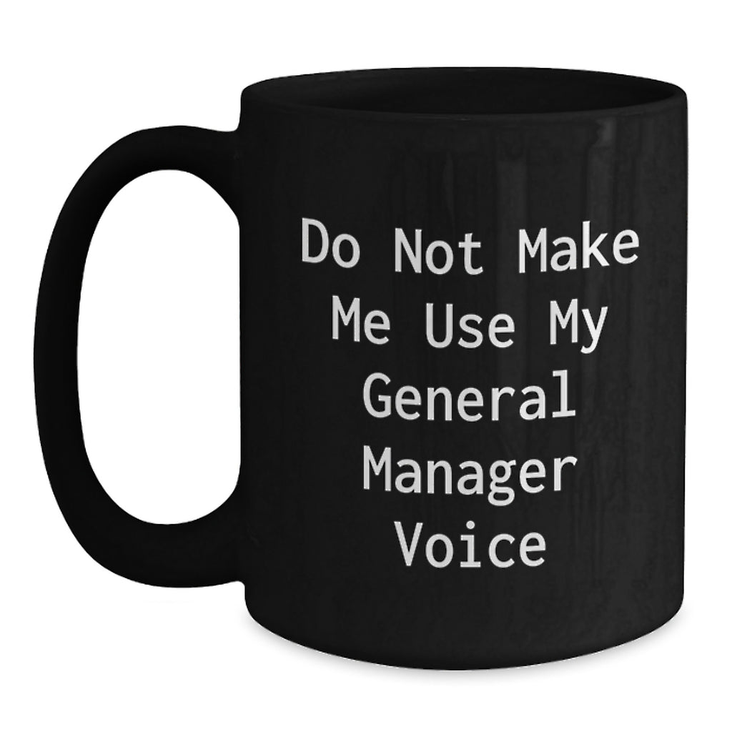 - Get the ideal gift for your General Manager with our funny Christmas Black Coffee Mugs. These unique mugs are designed to bring a smile to your General Manager's face and make them laugh with the 'Do Not Make Me Use My General Manager Voice' quote. Made from high-quality ceramic material, these mugs are microwave and dishwasher safe, making them easy to use and clean.