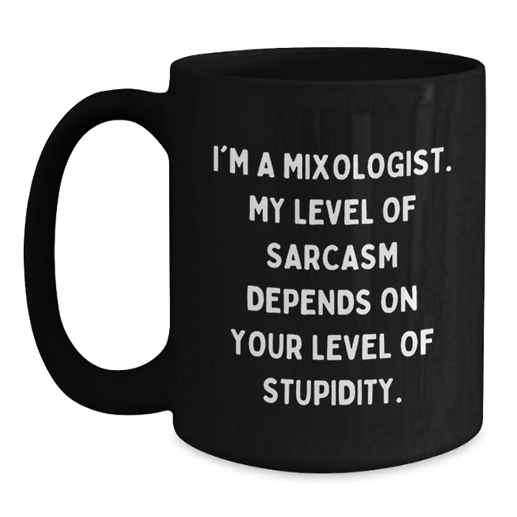 - This funny Mixologist Black Coffee Mug is a great way to show off your personality and sense of humor. The unique design and humorous quote, 'I'm a Mixologist. My level of sarcasm depends on your level of stupidity.', make it a great gift for anyone who loves coffee and has a sense of humor.