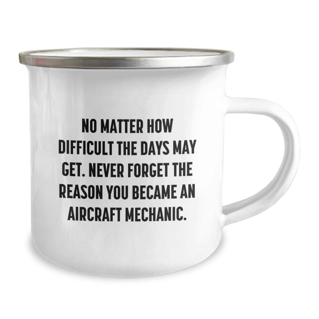 No Matter How Difficult The Days May Get. Never Forget The Reason You Became An Aircraft Mechanic. This motivational quote is a reminder of the passion and dedication that drives Aircraft Mechanics to keep pushing forward, even on the toughest days. Whether you're out in the field or enjoying a quiet moment at home, this Aircraft Mechanic Camping Mug will keep your spirit lifted and your heart connected to the Aircraft Mechanic way of life.