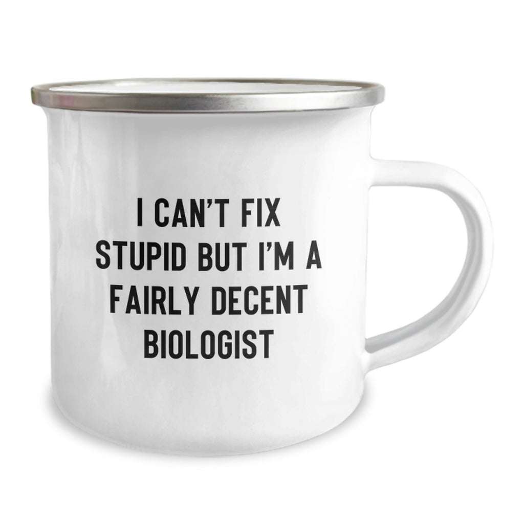 - This Funny Biologist Christmas Gift from Friends for Biologist Camping Mug is the perfect addition to any biologist's collection. Made of high-quality stainless steel with a sturdy enamel finish, this camping mug is both functional and stylish. The permanent printing ensures that the quote 'I Can't Fix Stupid But I'm A Fairly Decent Biologist' won't fade after washing. This gift is perfect for biologists who love to camp and enjoy a good cup of coffee or tea.