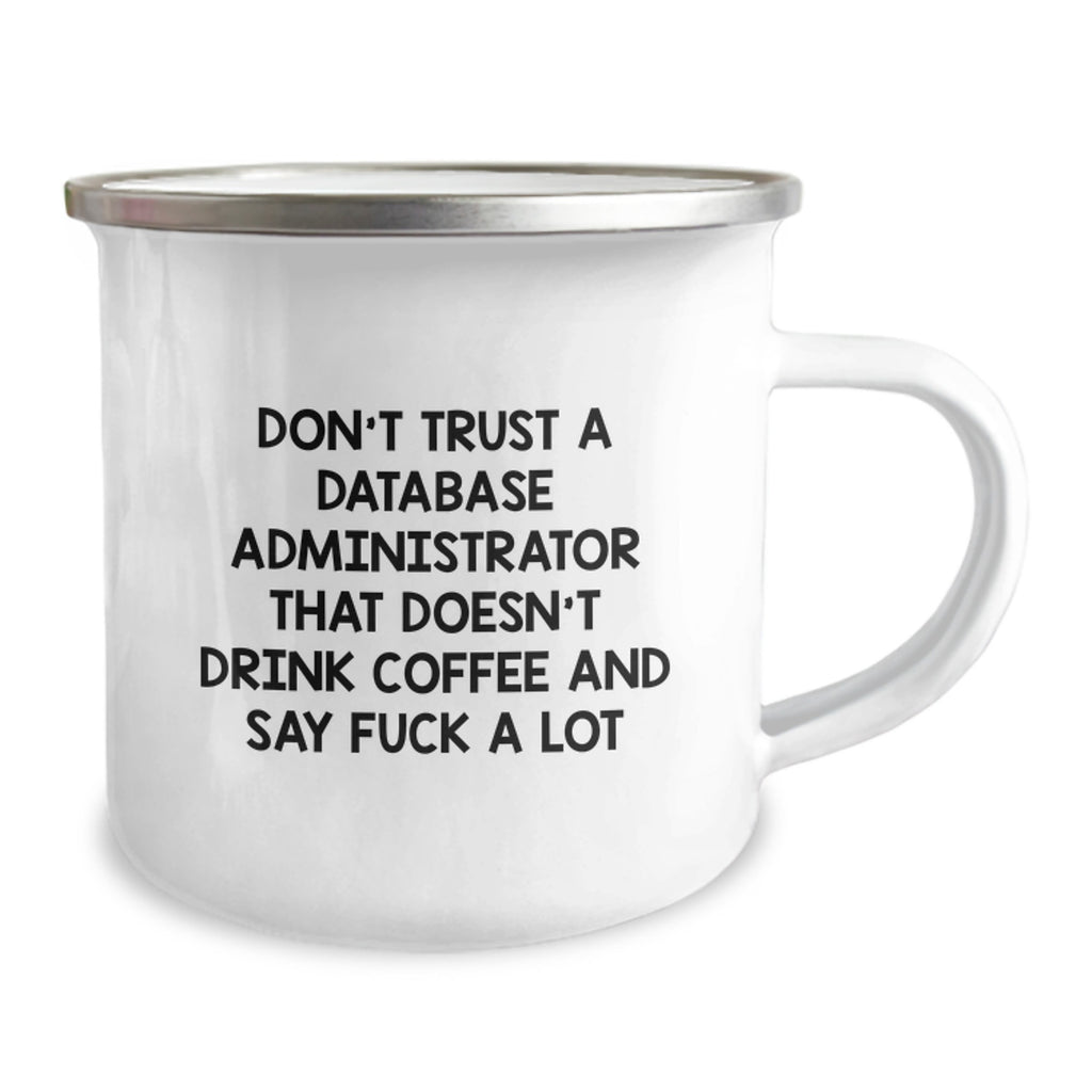 - Experience the best of both worlds with our unique Database Administrator Camping Mug, featuring a quote that resonates with fellow tech enthusiasts: 'Don't Trust A Database Administrator That Doesn't Drink Coffee And Say F--k A Lot'.