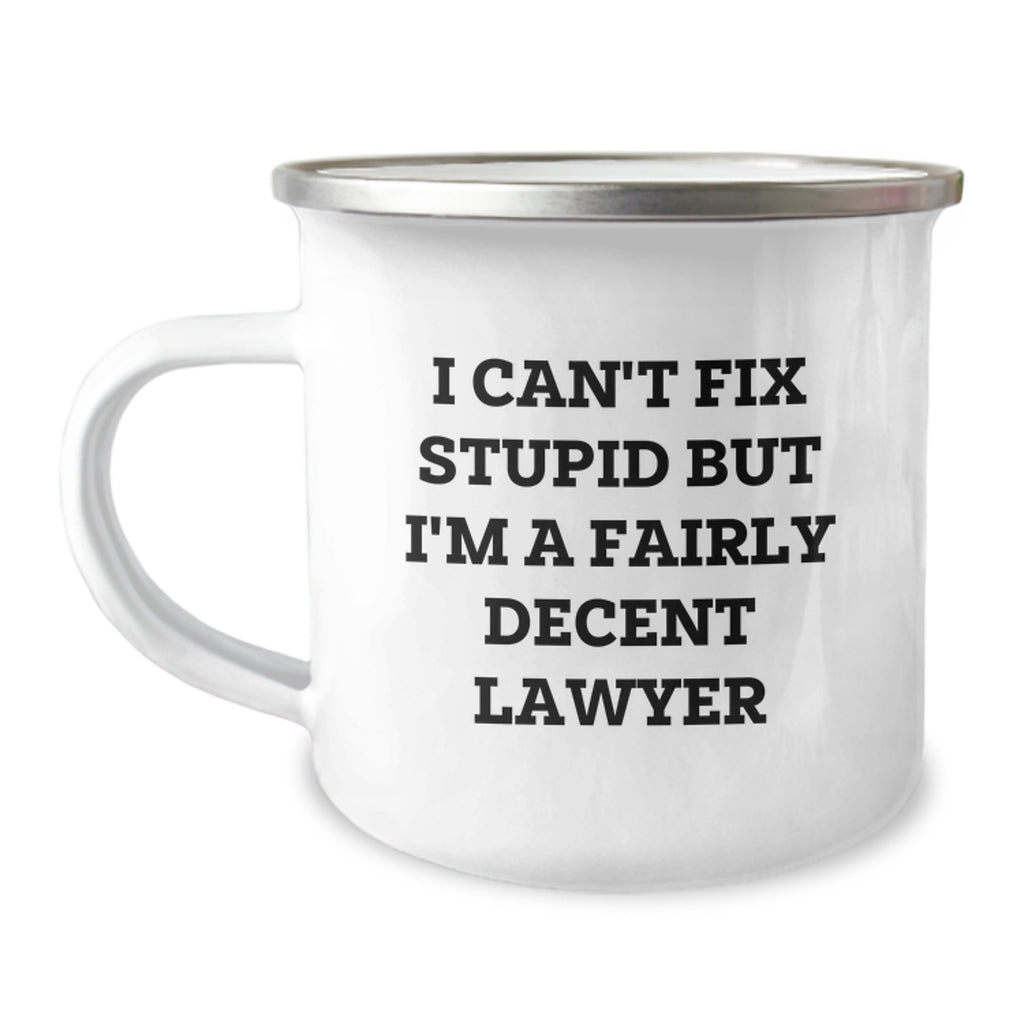 - Get ready to show off your lawyer pride with this hilarious mug that says 'I Can't Fix Stupid But I'm A Fairly Decent Lawyer' - the ideal gift for any lawyer who loves to camp or enjoy a cup of coffee in the great outdoors. Made from high-quality stainless steel with an enamel finish, this mug is sturdy and long-lasting, perfect for daily use. Whether you're a lawyer yourself or just a fan of the law, this mug is sure to bring a smile to your face.