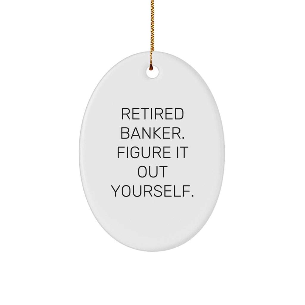 • This funny oval ornament is the perfect way to show your appreciation for the retired banker in your life. With its vibrant colors and humorous quote, 'Figure It Out Yourself', this gift is sure to bring a smile to their face.