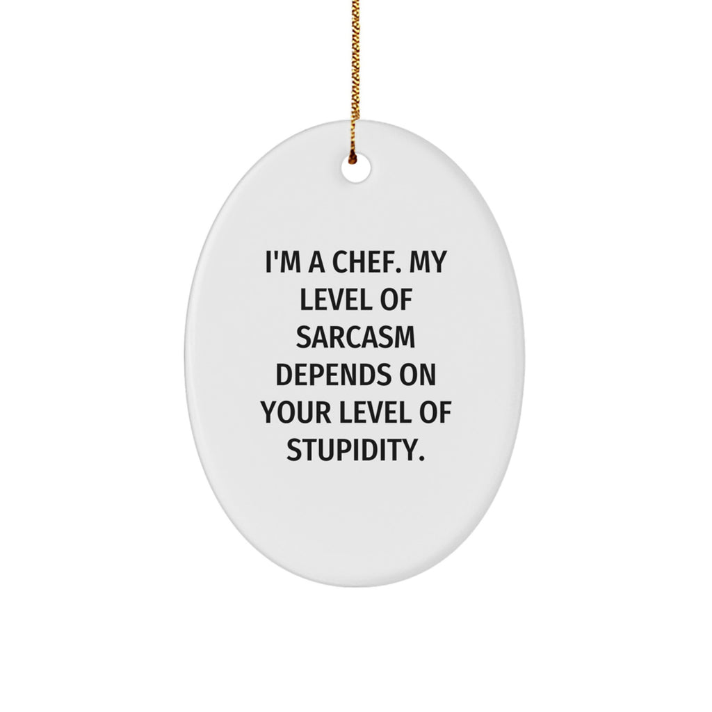 - Add a touch of humor to any kitchen with this unique Oval Ornament, featuring the quote 'I'm A Chef. My Level Of Sarcasm Depends On Your Level Of Stupidity.' - a great gift for any chef or foodie