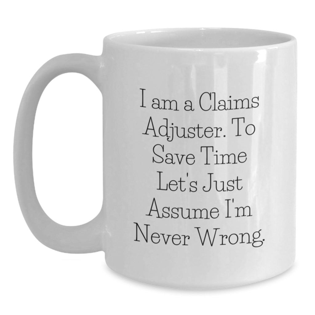 The quote 'I Am A Claims Adjuster. To Save Time Let's Just Assume I'm Never Wrong.' is a humorous take on the Claims Adjuster's reputation for being confident in their assessments. The White Coffee Mug is a thoughtful gift for any Claims Adjuster, and its ceramic material ensures it's sturdy and long-lasting.