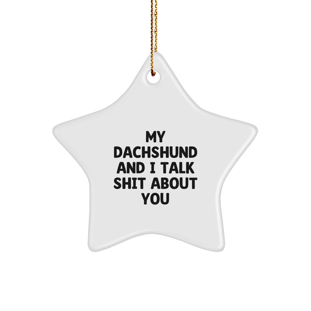 Looking for a unique Christmas gift for a Dachshund Dog lover? Our Funny Star Ornament is the perfect present! Featuring a hilarious quote, 'My Dachshund And I Talk Shit About You', this ornament is sure to bring a smile to their face. Made from sturdy MDF with a high-gloss plastic finish, it's lightweight and resistant to breaking. Perfect for households with children or pets. Ships with a festive gold cord for easy hanging. Whether you're buying for a friend, family member, or coworker, this ornament is a thoughtful and humorous gift. So why wait? Get your Dachshund Dog Star Ornament today and make their Christmas a little brighter!