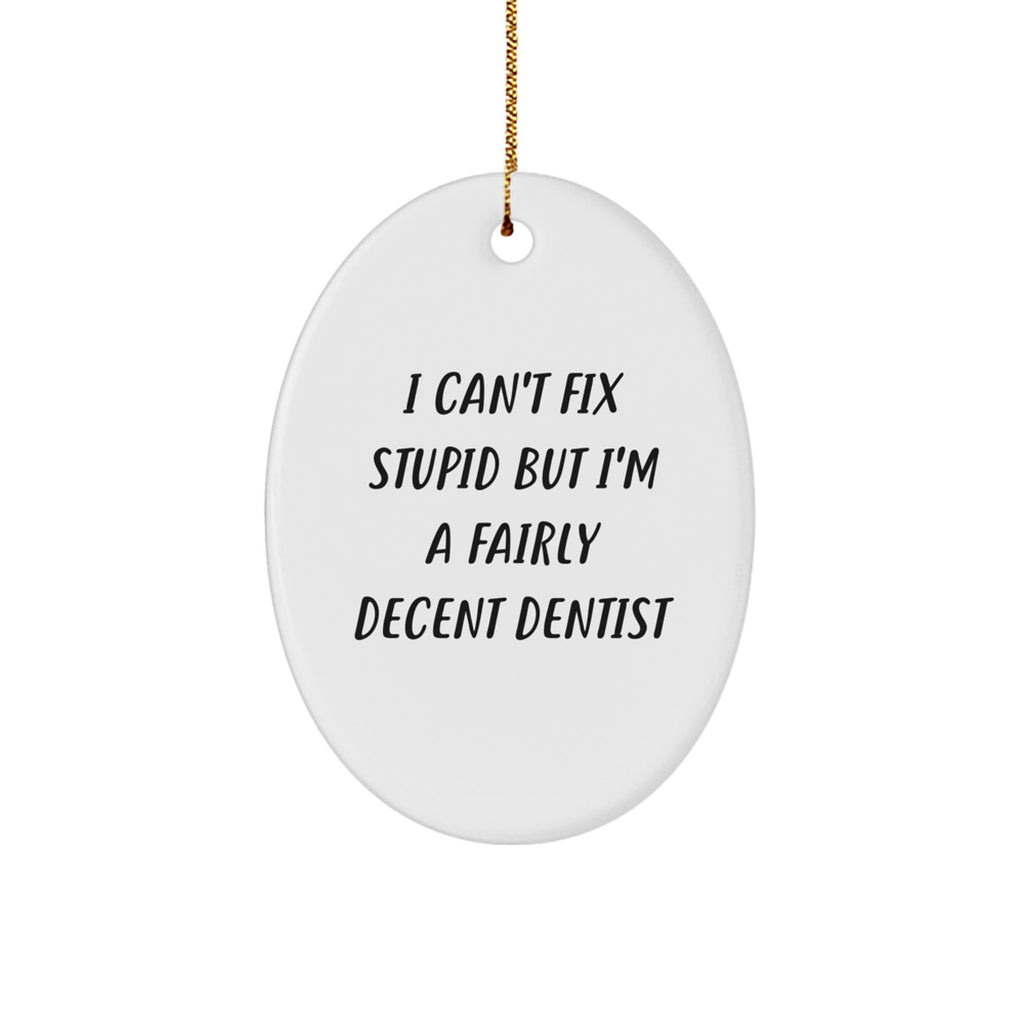 - Show off your dental pride this holiday season with this one-of-a-kind 'I Can't Fix Stupid But I'm A Fairly Decent Dentist' Oval Ornament. Its unique design and vibrant colors are sure to spark conversations and add a touch of personality to your holiday decor. Perfect for dentists, dental offices, or anyone who loves a good pun.