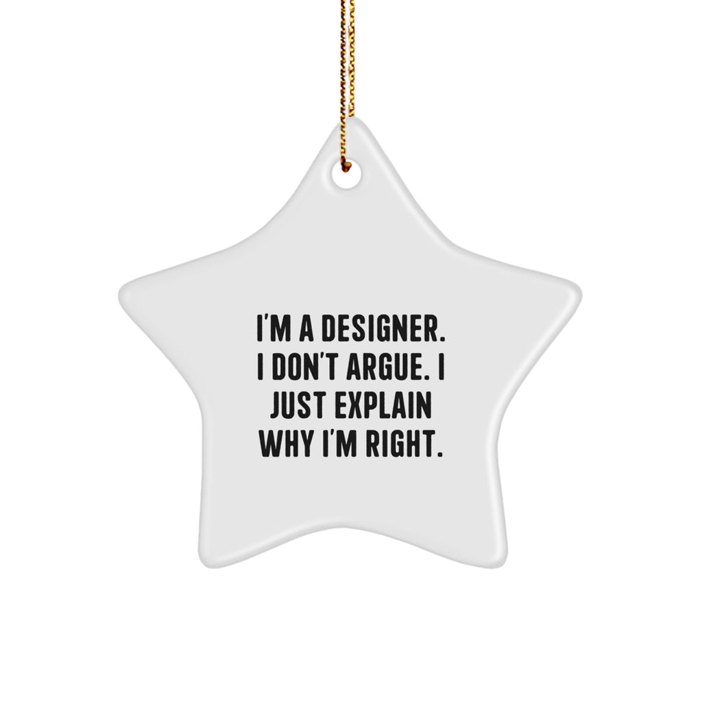 • This Star Ornament is a thoughtful and humorous gift for designers, friends, or family members who love to create and express themselves through art. The quote 'I'm A Designer. I Don't Argue. I Just Explain Why I'm Right.' is a funny and relatable way to showcase their personality.