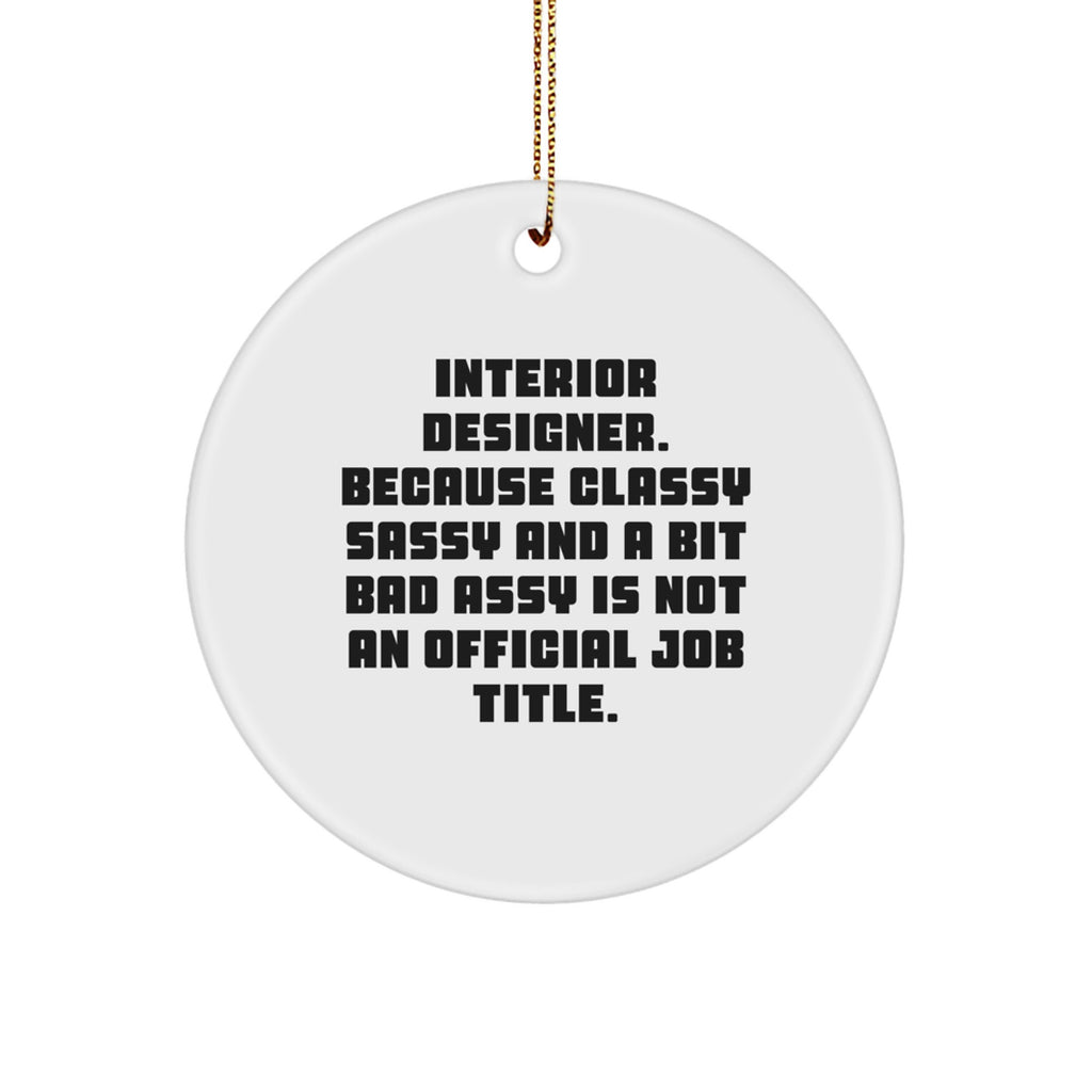 - Our Funny Interior Designer Gifts for Her, Unique Circle Ornament with 'Interior Designer. Because Classy Sassy And A Bit Fearlessy Is Not An Official Job Title.' Quote, Christmas Unique Gifts are the perfect way to add a touch of humor to the interior designer in your life's holiday decor. Made from sturdy MDF with a high-gloss plastic finish, these ornaments are long-lasting and feature bright, vivid colors that will add a pop of color to any room.