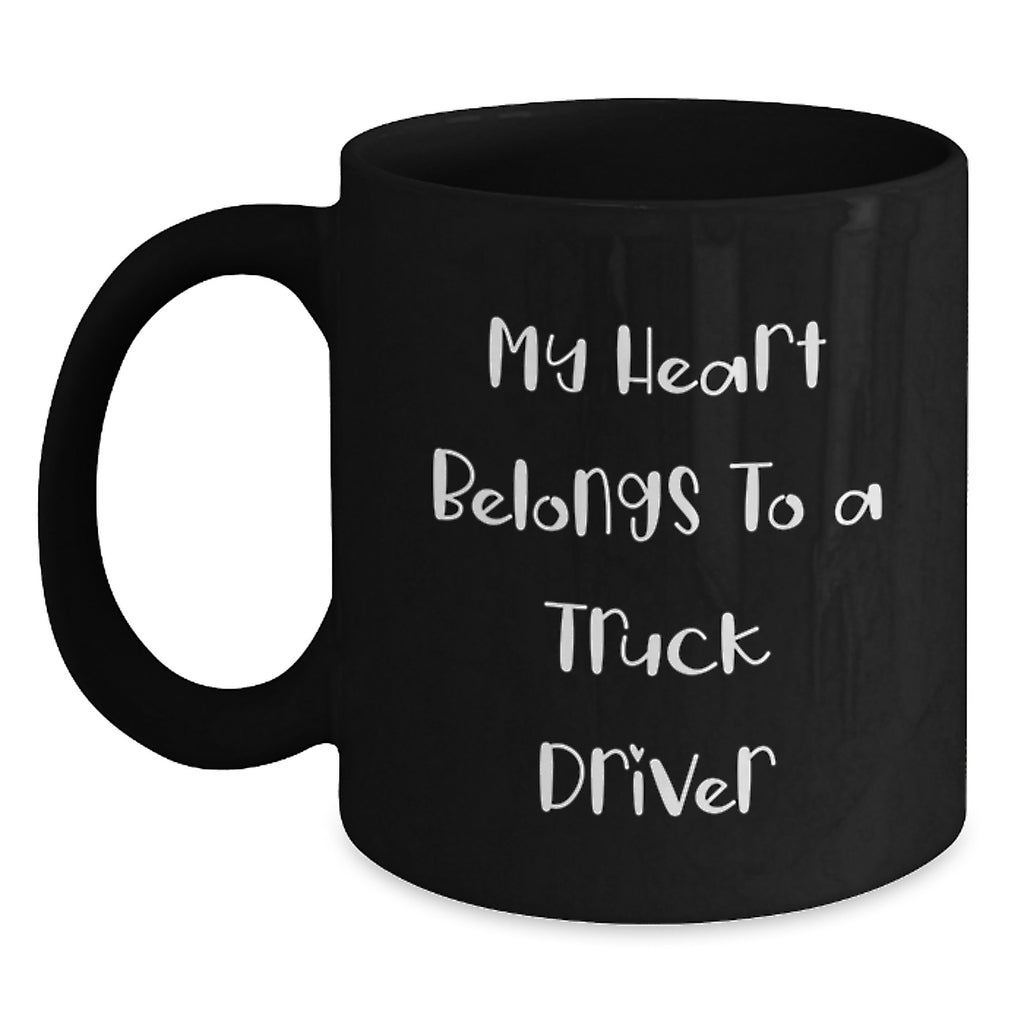 Funny Truck Driver Gifts from Friends - 'My Heart Belongs To A Truck Driver' Black Coffee Mug for Birthday, Unique and Thoughtful Present for Him