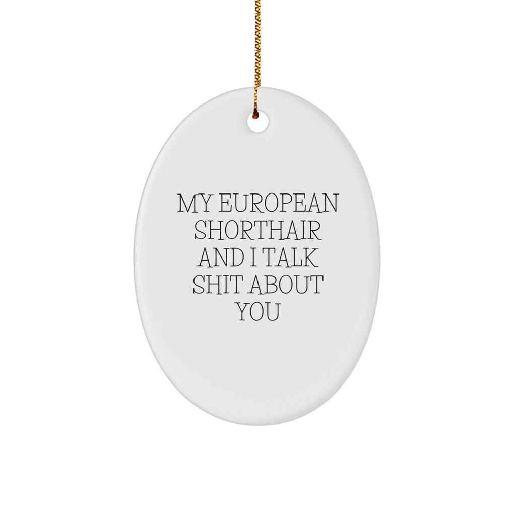 - Unique oval ornament with funny quote 'My European Shorthair And I Talk Shit About You' that's sure to bring a smile to anyone's face