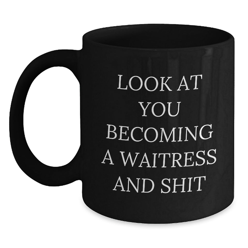 - This funny coffee mug is the ideal gift for any waitress friend, coworker, or family member. With its witty quote, 'Look At You Becoming A Waitress And Shit', it's sure to bring a smile to their face. Made from high-quality ceramic, this 11oz or 15oz mug is both sturdy and microwave and dishwasher safe, making it a great addition to any kitchen. Whether you're looking for a funny gift for a waitress or just want to show your appreciation for all that they do, this mug is a great choice.