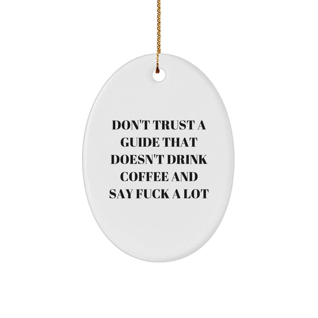 - This Funny Guide Oval Ornament is the ideal gift for any Guide enthusiast, with its vibrant colors and humorous quote that says 'Don't Trust A Guide That Doesn't Drink Coffee And Say F--k A Lot'. Made from sturdy MDF with a high-gloss plastic finish, it's sure to last for years to come.