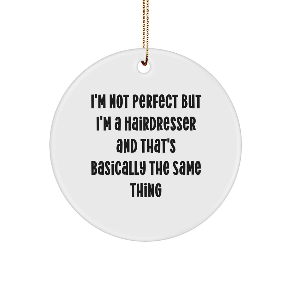 Are you a friend or family member looking for a unique and humorous gift for the hairdresser in your life? Look no further! Our Circle Ornament is the perfect present for any hairdresser enthusiasts, with a funny quote that will surely bring a smile to their face: 'I'm Not Perfect But I'm A Hairdresser And That's Basically The Same Thing'.
