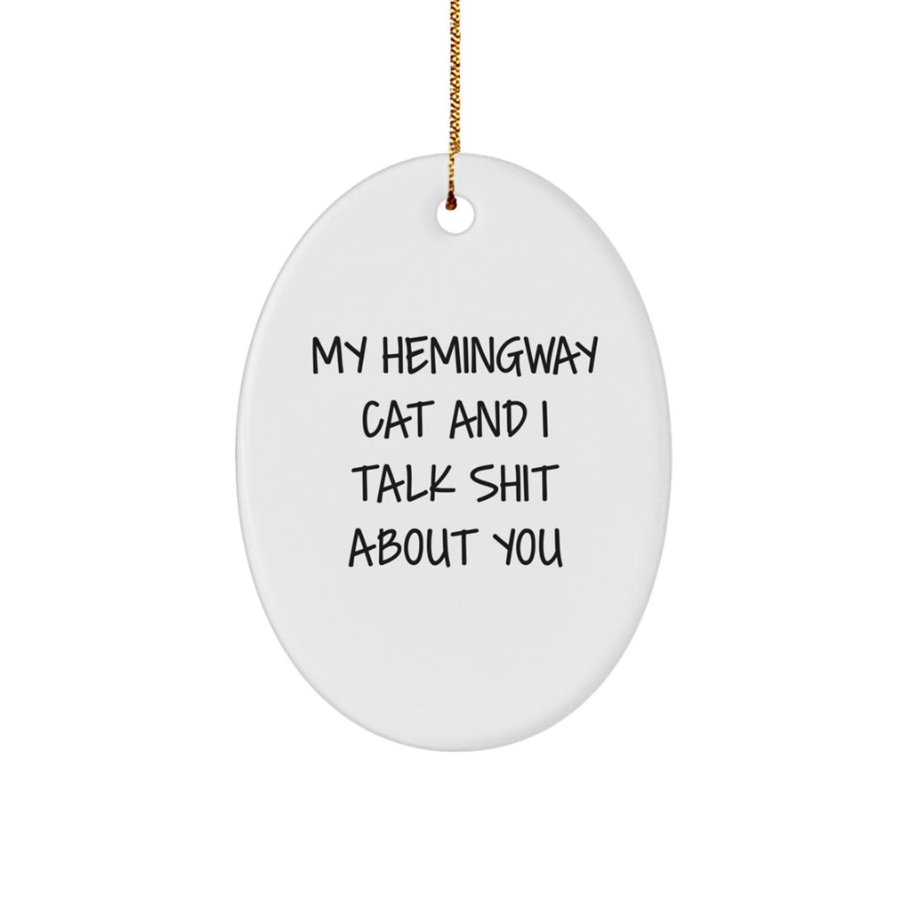 - Showcase your love for the iconic Hemingway Cat with this vibrant Oval Ornament, featuring the famous quote 'My 'Hemingway Cat' And I Talk Shit About You' in a bold, eye-catching design. Perfect for adding a touch of whimsy to your Christmas decorations, this ornament is sure to spark conversations and bring joy to friends and family.