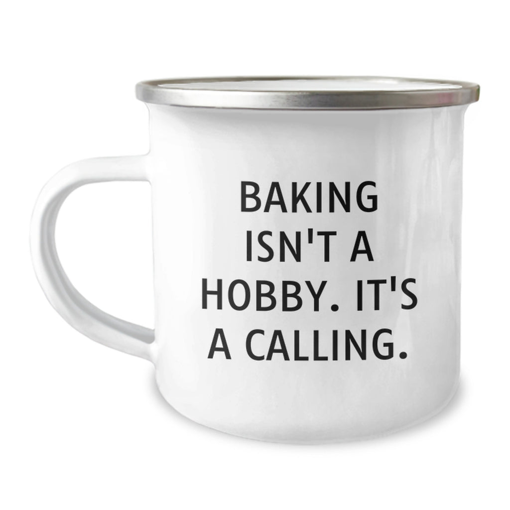 - This funny baking quotes camping mug is a great way to show off your personality and interests, and the quote 'Baking Isn't A Hobby. It's A Calling.' is a humorous take on the passion and dedication that bakers have for their craft. Made from sturdy stainless steel with a enamel finish, this mug is both easy to clean and long-lasting.