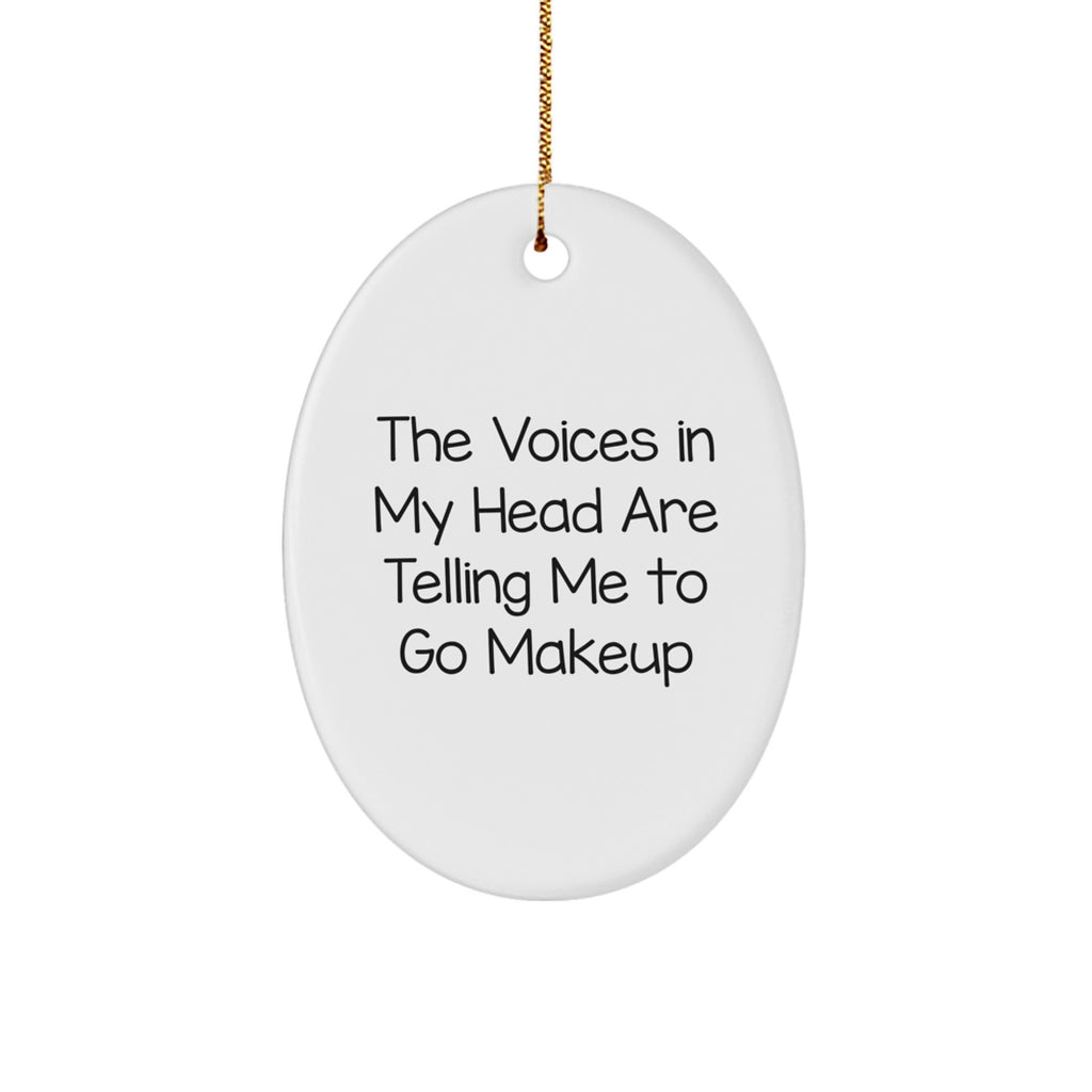 - Add a touch of humor to your makeup routine with this hilarious oval ornament, featuring the quote 'The Voices In My Head Are Telling Me To Go Makeup' - a great gift idea for makeup enthusiasts and anyone who loves a good laugh!