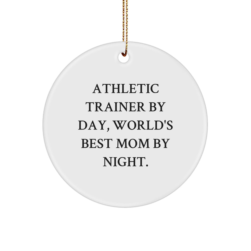 - A perfect and thoughtful gift for athletic trainers, this circle ornament is designed to bring a smile to their face. The quote 'Athletic Trainer By Day, World's Best Mom By Night' is a playful and humorous take on their dual roles.