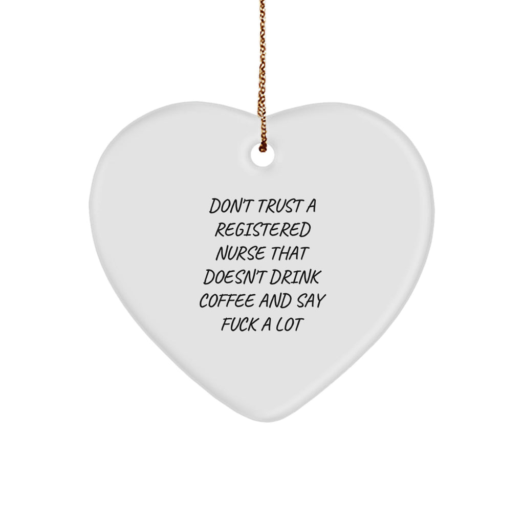 - This funny Heart Ornament is a heartwarming addition to any Registered Nurse's office or home, featuring the humorous quote 'Don't Trust A Registered Nurse That Doesn't Drink Coffee And Say F--k A Lot'. The vibrant quote is printed from edge-to-edge via Sublimation, making it a beautiful addition to any space. This Heart Ornament is crafted from sturdy MDF with a high-gloss plastic finish, ensuring bright, vivid colors that will last for years to come.