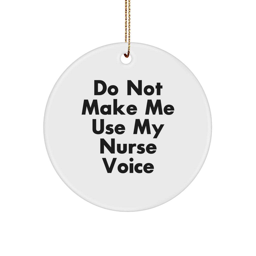 Share the laughter and spread the cheer with this funny quote, 'Do Not Make Me Use My Nurse Voice.' It's a humorous reminder to keep the holiday spirit alive and to always prioritize kindness and compassion. This Circle Ornament is the perfect way to add a touch of whimsy and humor to your holiday decor. So go ahead, gift it to your favorite nurse, and watch as they brighten up the holiday season with their infectious laughter and joy.