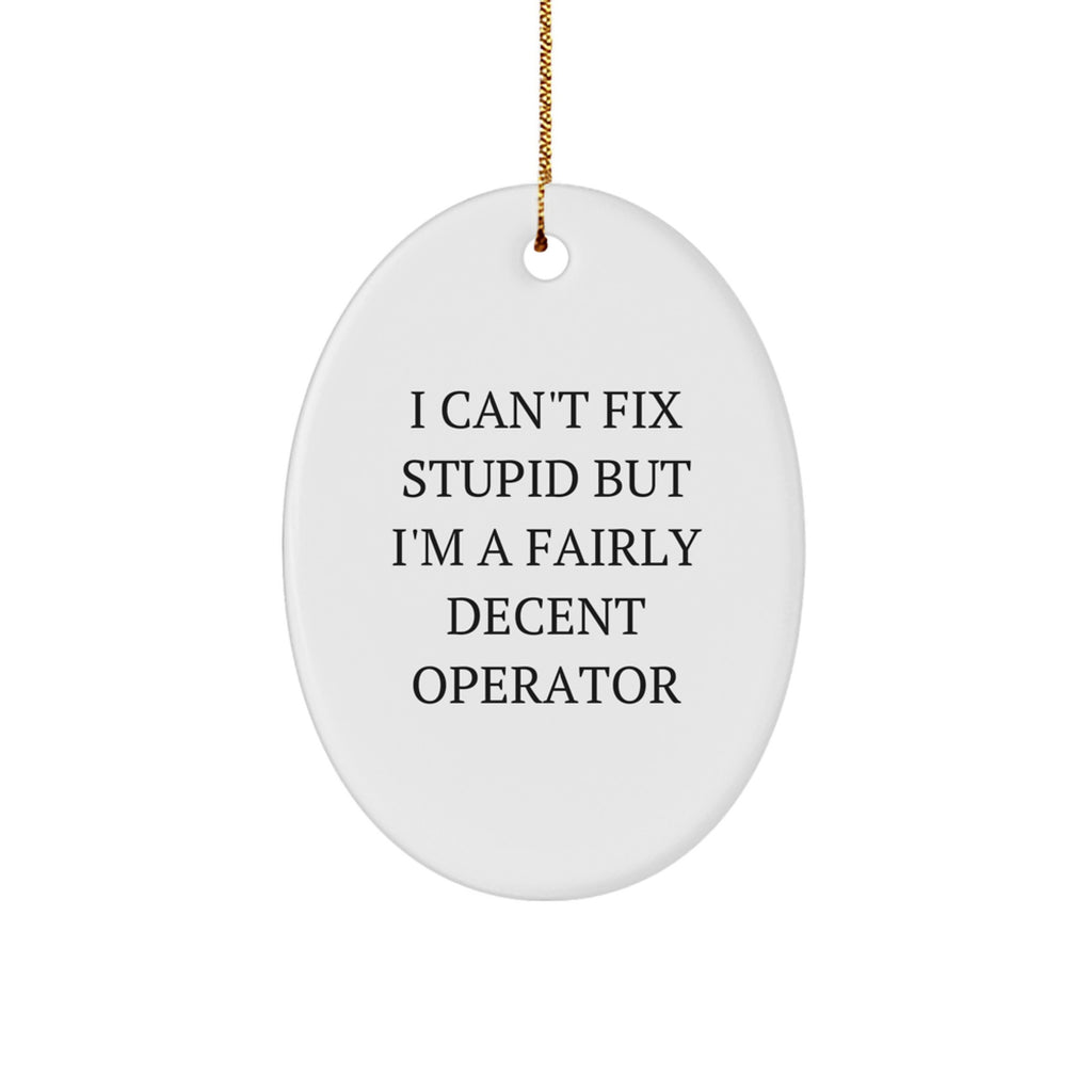 - This Operator Oval Ornament is the ideal gift for anyone who loves a good dose of humor and a little bit of sarcasm. The funny quote 'I Can't Fix Stupid But I'm A Fairly Decent Operator' is vibrantly printed from edge-to-edge via Sublimation, ensuring bright, vivid colors that will last for years to come. It's carefully crafted from sturdy MDF (a strong, engineered wood product) with a high-gloss plastic finish, making it a great choice for households with children or pets.