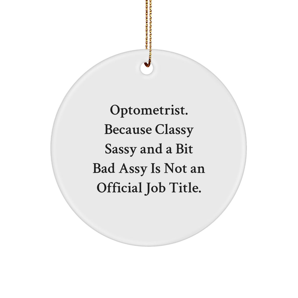 - Add a touch of elegance to your holiday decor with this unique Optometrist-themed Circle Ornament, 'Optometrist. Because Classy Sassy And A Bit Bad Assy Is Not An Official Job Title.' perfectly capturing the spirit of the season. Made from durable MDF with a high-gloss plastic finish, this vibrant ornament is lightweight and resistant to breaking, making it a great choice for households with children or pets.
