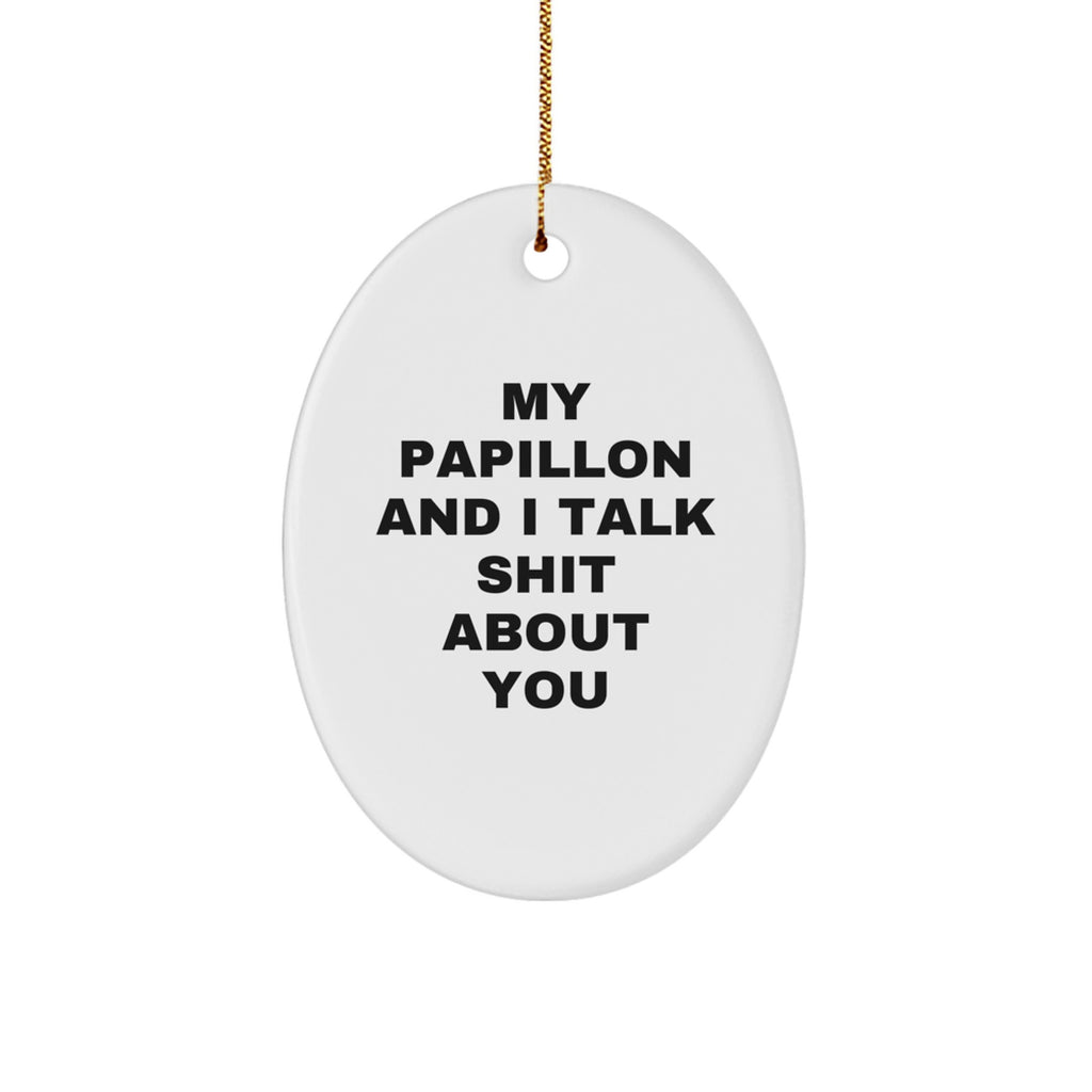 - Add a touch of humor to your holiday decor with this funny Papillon Dog Oval Ornament, featuring the hilarious quote 'My Papillon And I Talk Shit About You'. Perfect for Papillon Dog lovers and anyone who appreciates a good laugh.