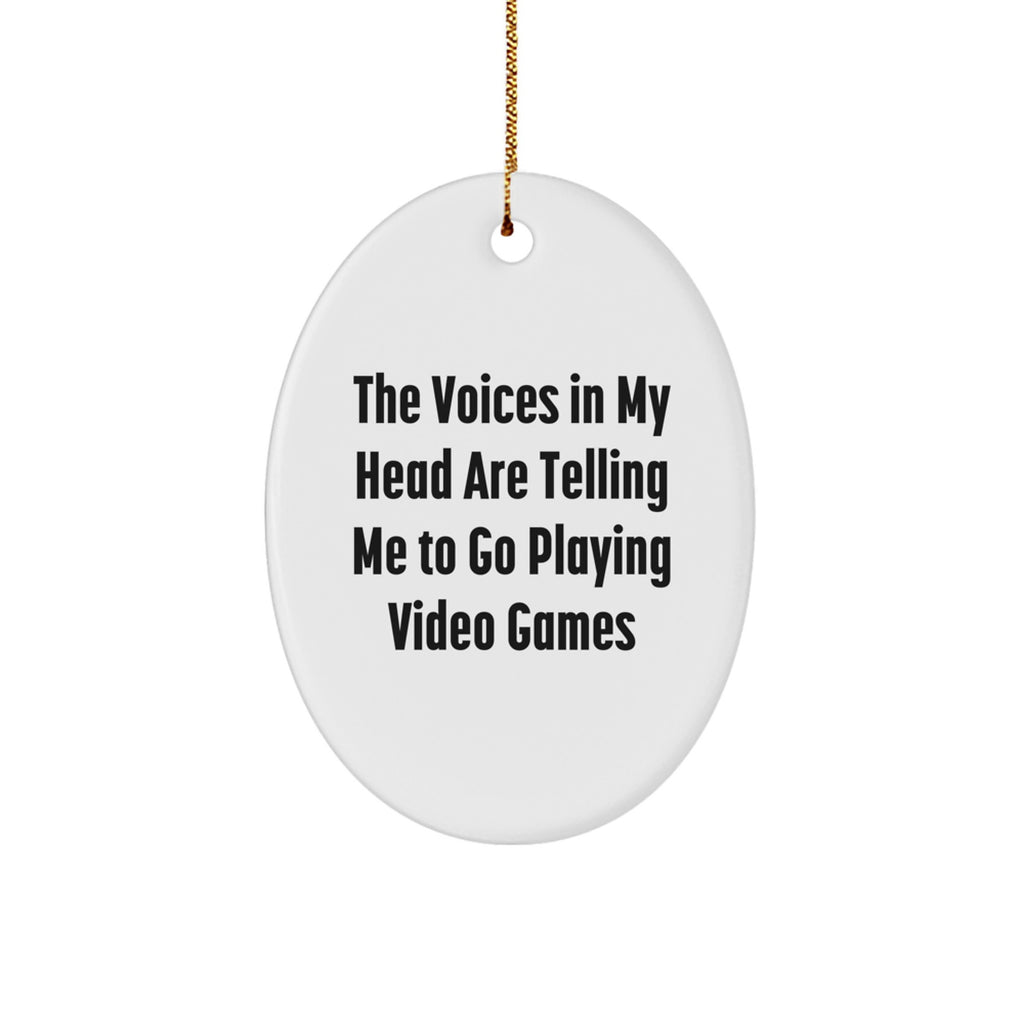 - This oval ornament is a unique and funny gift idea for playing video games lovers. It's a great way to show your support and encouragement for their gaming habits. The quote 'The Voices In My Head Are Telling Me To Go Playing Video Games' will surely make your friends laugh.