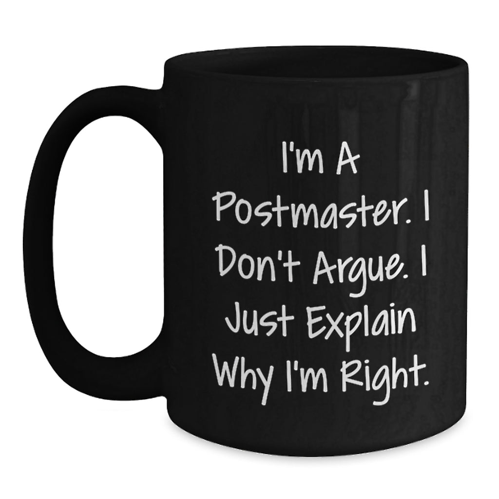 - This funny black coffee mug is the ideal gift for any Postmaster, whether it's for Christmas or any other occasion. The quote 'I'm a Postmaster, I Don't Argue, I Just Explain Why I'm Right' is a humorous way to express your personality and sense of humor.