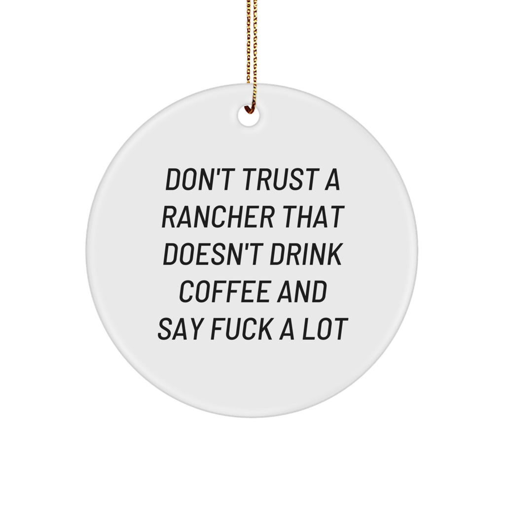 - The perfect 'don't trust a rancher that doesn't drink coffee and say fuck a lot' gift for the rancher in your life, featuring a vibrant white circle ornament that's sure to brighten up their holiday decor (200-250 characters)