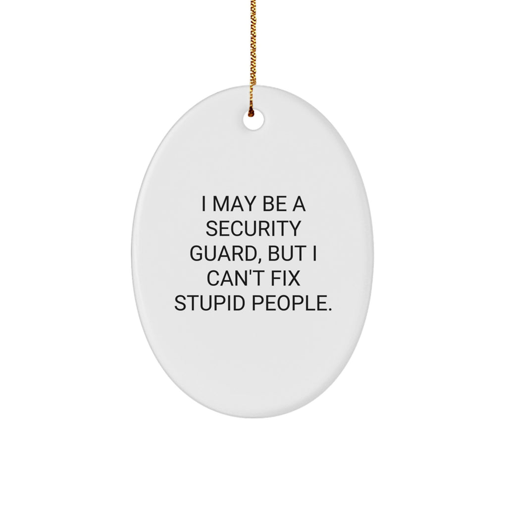 Are you looking for a unique and humorous gift for the security guard in your life? Look no further! This oval ornament is a fun and lighthearted way to show your appreciation for their hard work and dedication. The quote 'I May Be A Security Guard, But I Can't Fix Stupid People.' is a humorous take on the challenges of being a security guard, and is sure to bring a smile to their face. Made from sturdy MDF with a high-gloss plastic finish, this ornament is lightweight and resistant to breaking, making it a great choice for households with children or pets. The vibrant colors and festive gold cord make it easy to hang and display. Whether you're a friend, family member, or coworker, this ornament is the perfect way to show your support and appreciation for the security guard in your life. So why wait? Get your gift today and make this holiday season one to remember!