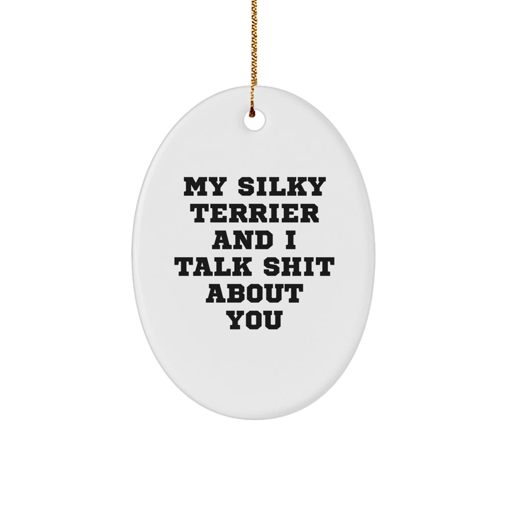 - Brighten up your holiday decor with this funny Silky Terrier Dog Oval Ornament featuring the quote 'My Silky Terrier And I Talk Shit About You'. A great way to add some humor to your home decor and show off your Silky Terrier Dog pride.