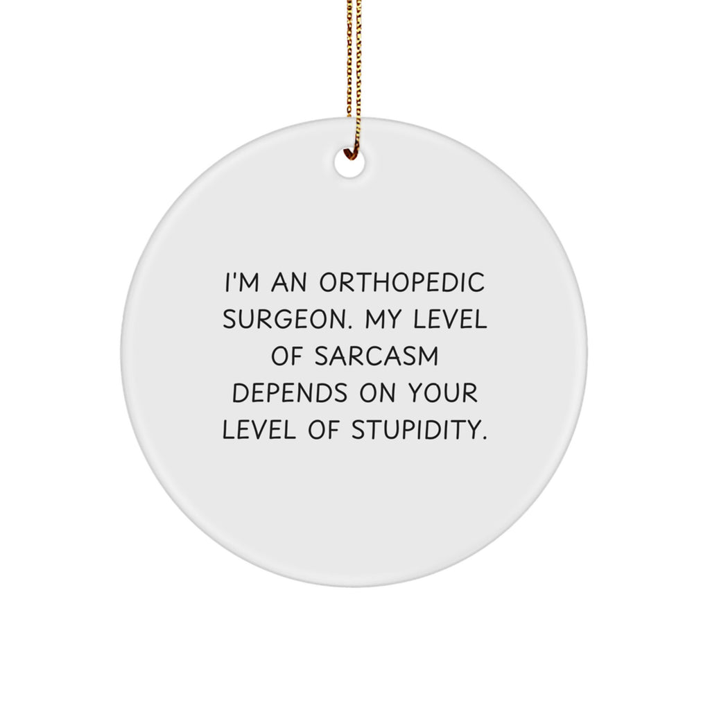 - Experience the wit of an Orthopedic Surgeon with this 'I'm An Orthopedic Surgeon. My Level Of Sarcasm Depends On Your Level Of Stupidity.' Circle Ornament, a unique gift for friends and family, showcasing your love for humor and medicine. Its vibrant print ensures a bright and eye-catching display, making it a perfect addition to any room. With its lightweight and durable design, this ornament is suitable for households with children or pets.