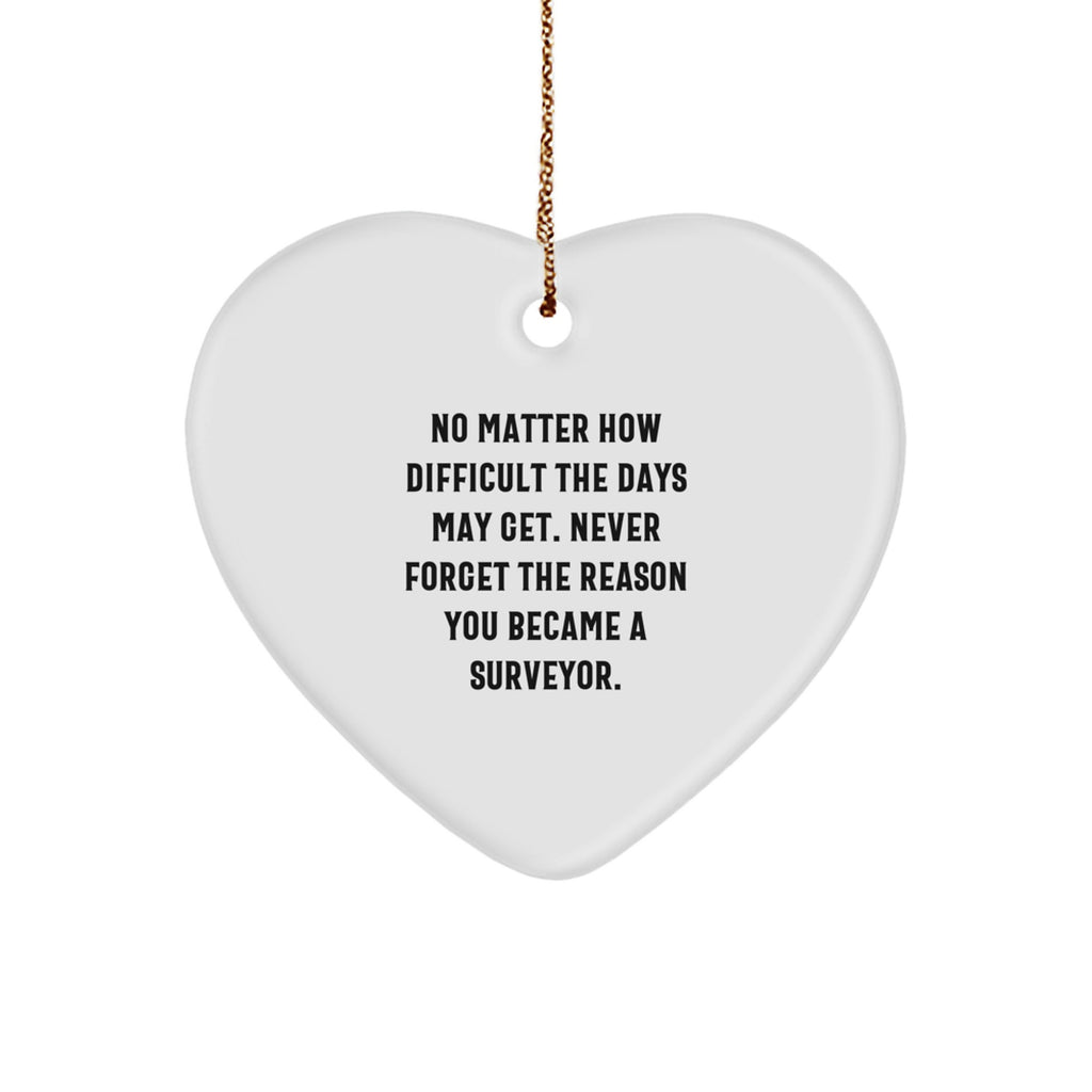 This Surveyor Heart Ornament is a thoughtful way to celebrate your passion for surveying and the hard work that comes with it. The quote 'No Matter How Difficult The Days May Get. Never Forget The Reason You Became A Surveyor' is a powerful reminder of your dedication and commitment to your craft. The heart-shaped design is a symbol of love and appreciation for the Surveyor in your life, making it a great gift for friends, family, or colleagues who share your passion for surveying.