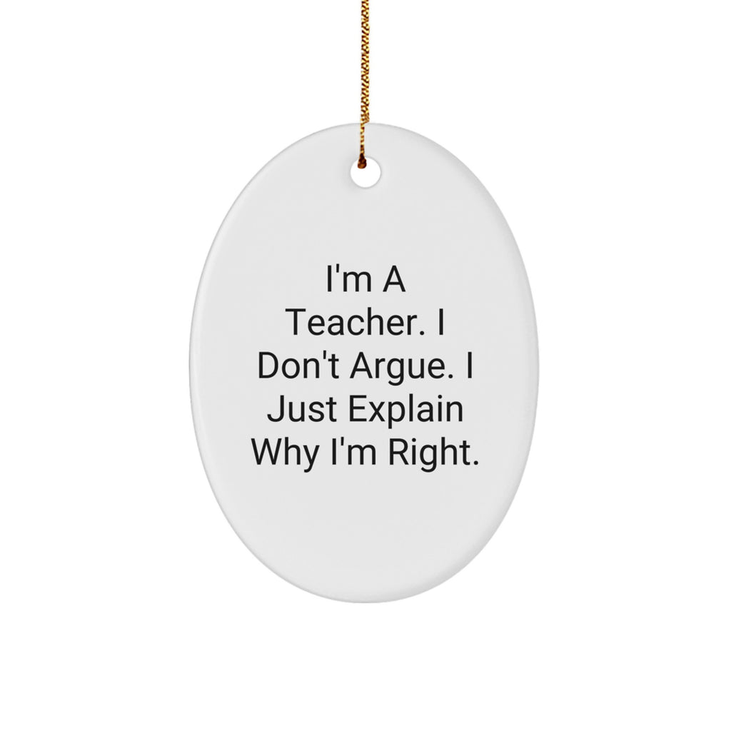- Order your 'I'm A Teacher. I Don't Argue. I Just Explain Why I'm Right.' Oval Ornament today and show your appreciation for the hardworking teachers in your life. They'll appreciate the thought and humor behind this unique gift, and you'll appreciate the smile on their face when they receive it. Don't forget to order extra for yourself - you never know when you might need a little humor in your life!
