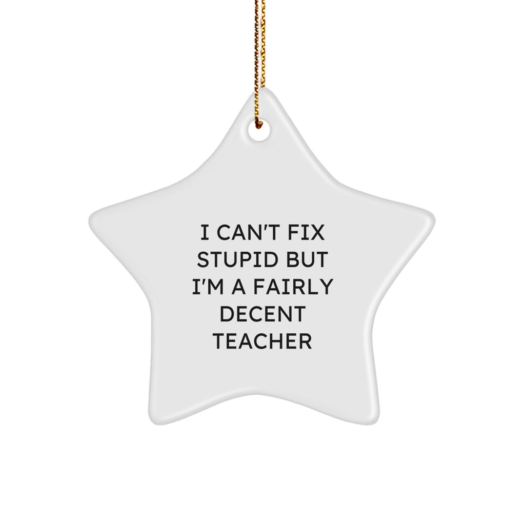 - Give the gift of laughter and appreciation to your teacher with this funny star ornament, featuring the quote 'I Can't Fix Stupid But I'm A Decent Teacher' - a ideal gift for the teacher who has everything. Made from sturdy MDF with a high-gloss plastic finish, this star ornament is a great way to show your teacher that you care.