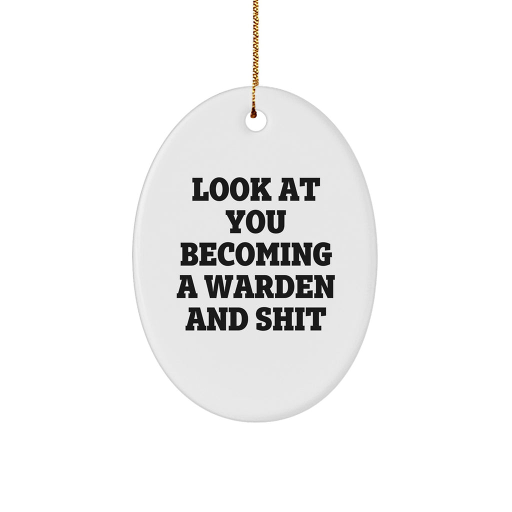 "keywords": "Warden, Oval Ornament, Warden Gifts, Funny Gifts, Christmas Gifts, Look At You Becoming A Warden And Shit, Friends Gifts, Warden Lover, Warden Presents, Unique Gifts, Humorous Gifts, Christmas Memorable Presents