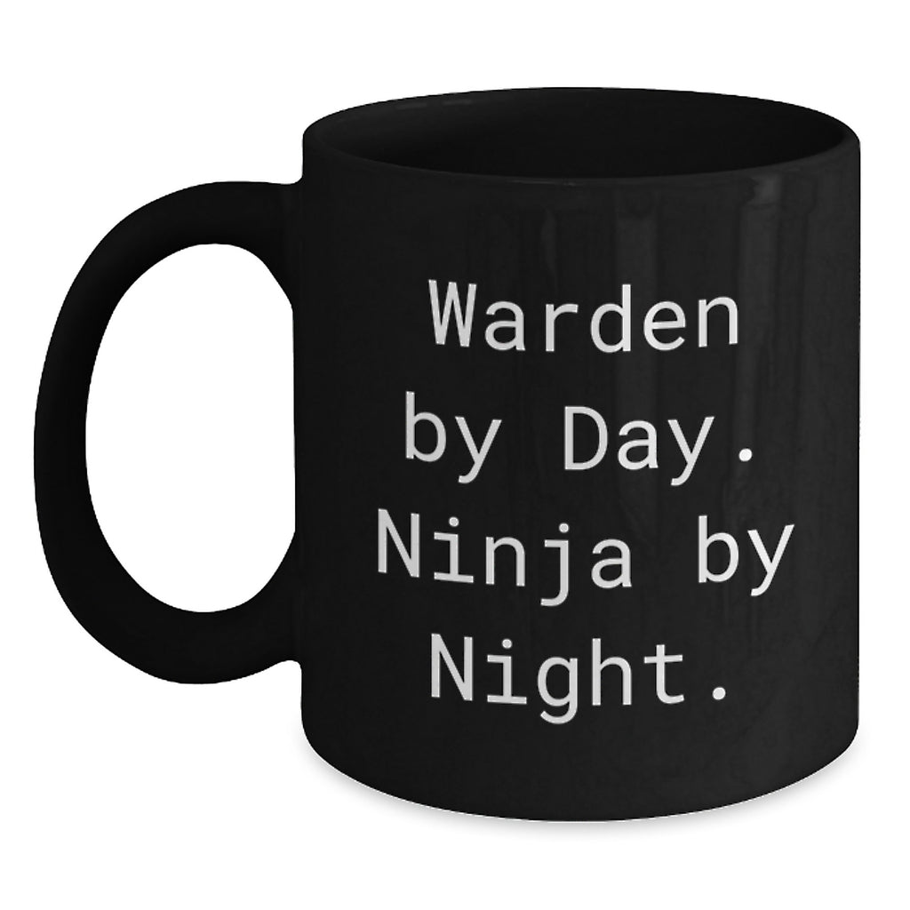 - This Warden black coffee mug is the ideal gift for any Warden fan, with a funny quote 'Warden By Day. Ninja By Night.' that's sure to bring a smile to his face. The high-quality ceramic material makes it sturdy and long-lasting, and it's available in two sizes, 11oz and 15oz.