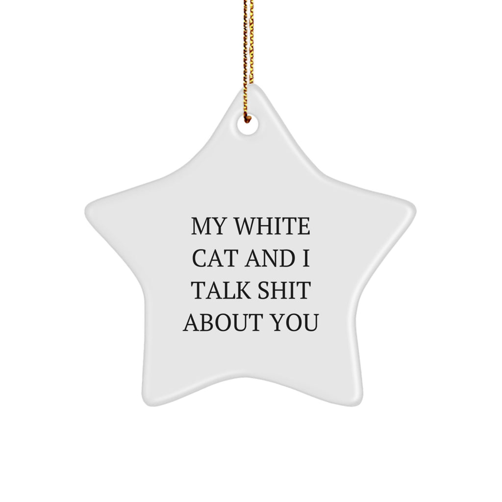 Funny White Cat Gifts from Friends for White Cat Lovers - Star Ornament with 'My White Cat And I Talk Shit About You' Quote - Christmas Unique Gifts