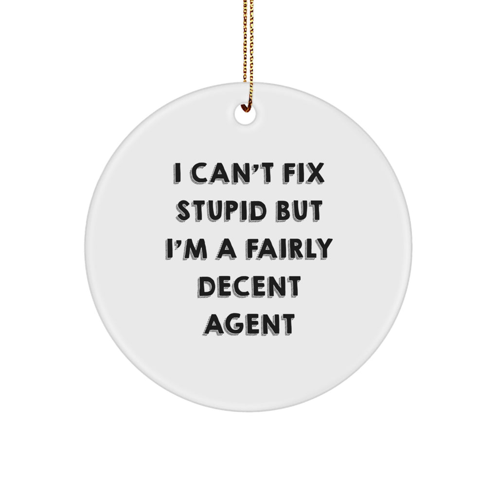 Agent Gifts from Friends - I Can't Fix Stupid But I'm A Fairly Decent Agent Circle Ornament, Funny Quote, White, 2.75 inches, Christmas Unique Gift for Agent, Men, or Women