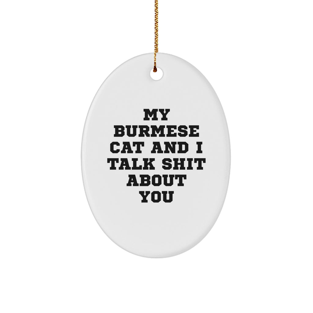 - This funny Oval Ornament is a unique and thoughtful gift for any Burmese Cat lover. The quote 'My Burmese Cat And I Talk Shit About You' is sure to bring a smile to their face.