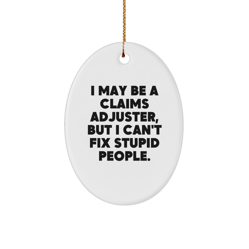 - Discover a unique gift for the Claims Adjuster in your life with this 'I May Be A Claims Adjuster, But I Can't Fix Stupid People' Oval Ornament, adding a touch of humor to their holiday decor.