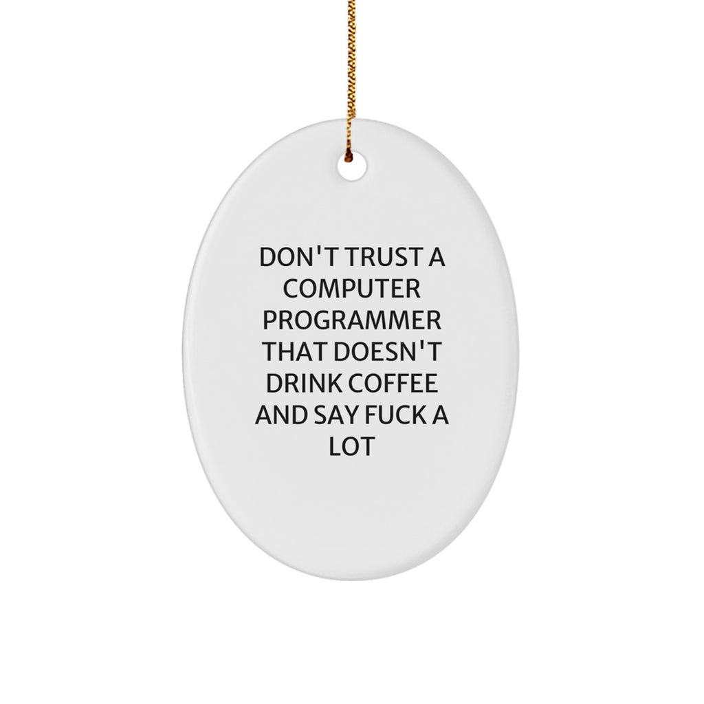 - A unique gift for the computer programmer in your life, this oval ornament is crafted with durability and style in mind. The 'Don't Trust A Computer Programmer That Doesn't Drink Coffee And Say Fuck A Lot' quote is vibrantly printed from edge-to-edge via Sublimation, ensuring bright, vivid colors that will stand out on any tree or shelf.
