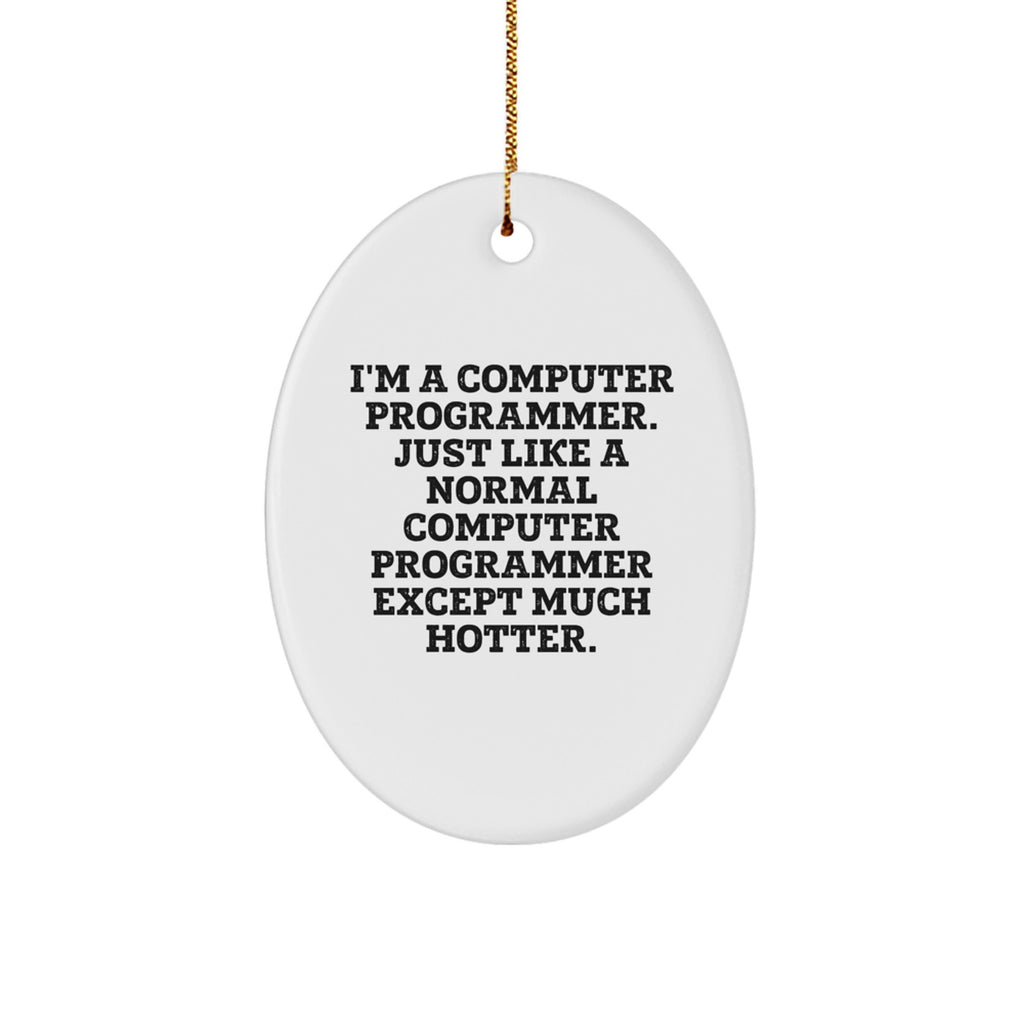 Looking for a unique gift for the computer programmer in your life? This funny oval ornament is the perfect addition to their holiday decor. The quote 'I'm A Computer Programmer. Just Like A Normal Computer Programmer Except Much Hotter.' is a humorous take on the stereotype of computer programmers being introverted and less social. This ornament is designed to bring a smile to their face and add a touch of humor to their home or office. Whether you're shopping for a male or female computer programmer, this gift is sure to be appreciated. The sturdy MDF material and high-gloss finish ensure that this ornament will withstand the test of time and maintain its vibrant colors. Plus, the festive gold cord makes it easy to hang and display. So why settle for a boring, generic gift when you can give a thoughtful and humorous one that shows you care? Get this funny computer programmer gift for Christmas and make it a holiday to remember!