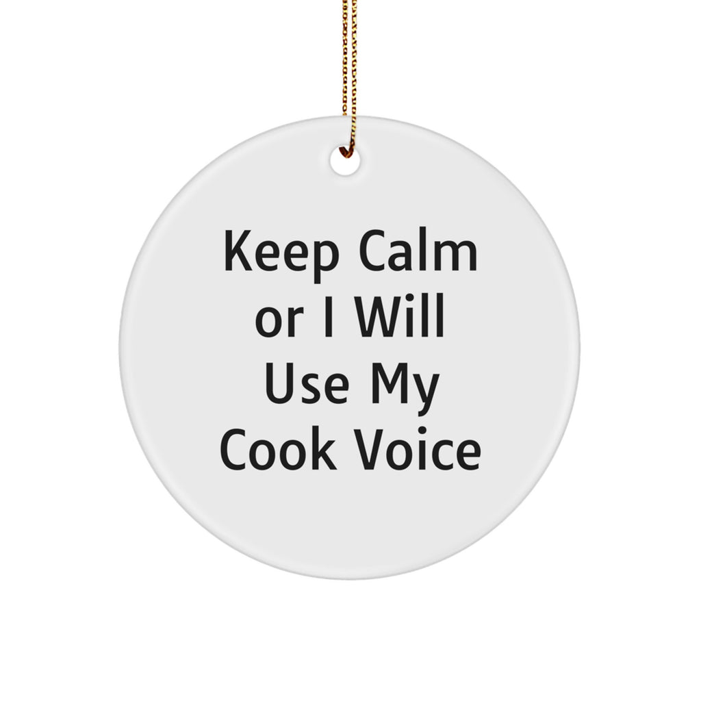 - Our Keep Calm Or I Will Use My Cook Voice Circle Ornament is a unique and thoughtful gift for any cook who loves to laugh and have fun in the kitchen. It's a perfect decoration for any cook's kitchen, adding a touch of humor and personality to their space.