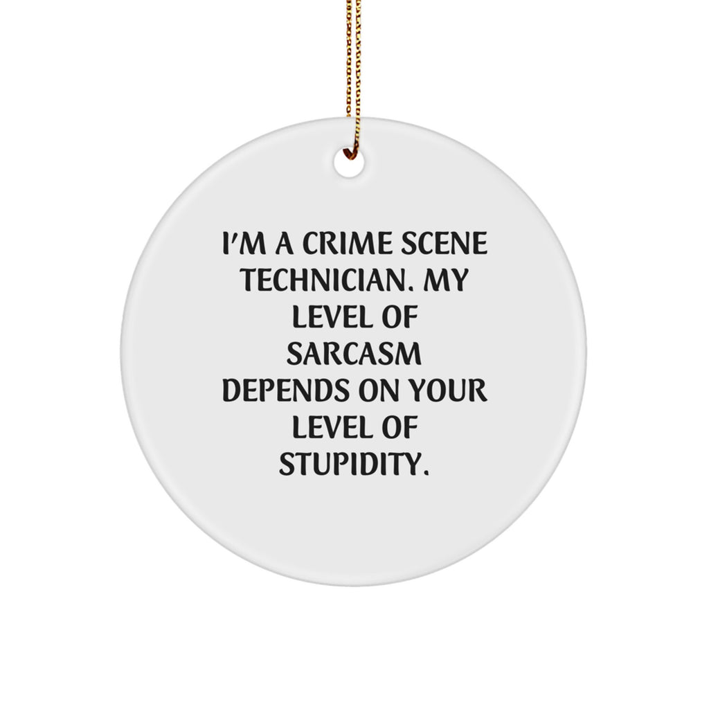 - Show off your sense of humor and love for Crime Scene Technicians with this funny Circle Ornament featuring a witty quote that says 'I'm A Crime Scene Technician, Sarcasm Level Depends On Your Stupidity'.