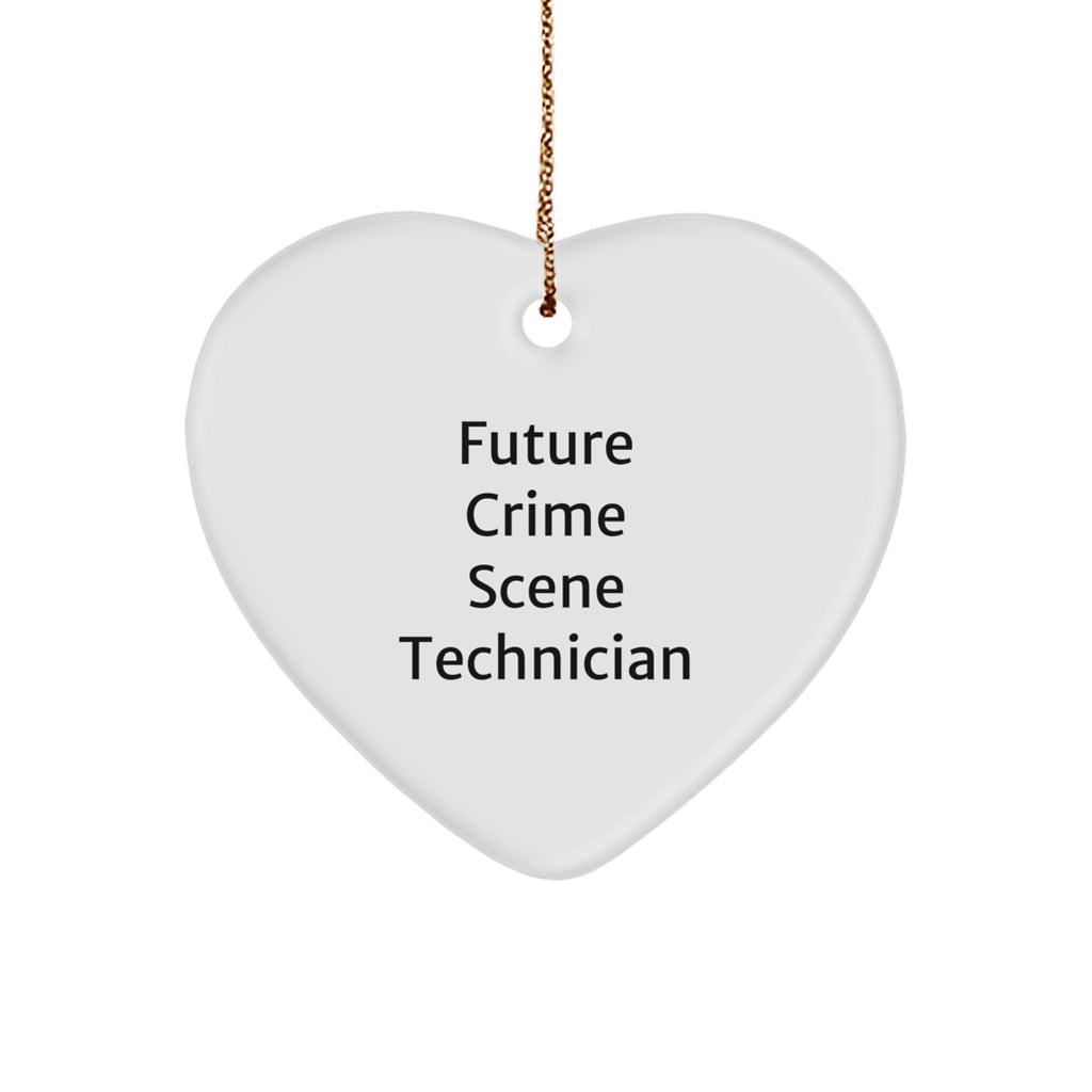 - This Funny Crime Scene Technician Heart Ornament is a thoughtful gift for any Future Crime Scene Technician. Made from sturdy MDF with a high-gloss plastic finish, it's lightweight and resistant to breaking, making it perfect for households with children or pets. The vibrant colors will catch the eye of any Crime Scene Technician, and the festive gold cord makes it easy to hang.