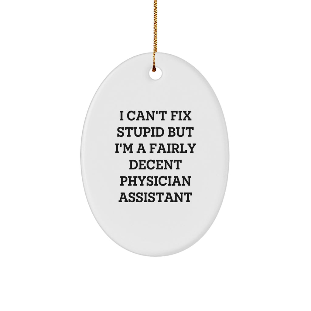 - Satisfy your love for medicine with our unique 'I Can't Fix Stupid But I'm A Fairly Decent Physician Assistant' Oval Ornament, crafted to bring a smile to the face of any medical professional, perfect for decorating your office space, and a thoughtful gift for physician assistants and their loved ones.