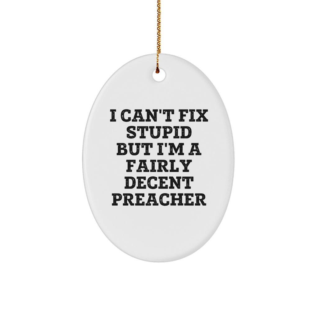 - Give the gift of laughter with this funny oval ornament that features a quirky quote about being a preacher. Made from sturdy MDF with a high-gloss plastic finish, this ornament is sure to last for years to come. The ideal gift for the preacher in your life who always knows how to make you smile.