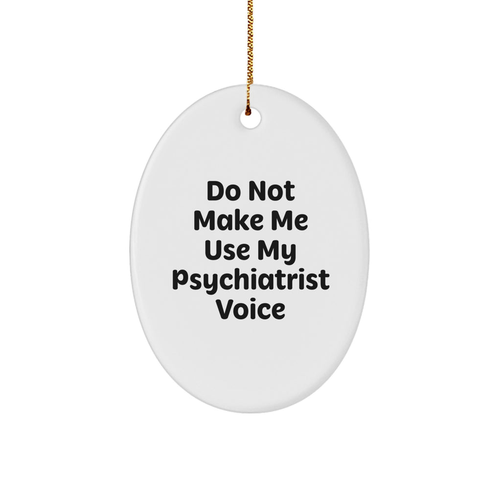 • Give a gift that's both funny and thoughtful – our Oval Ornament featuring the quote 'Do Not Make Me Use My Psychiatrist Voice' is the perfect choice. It's a great way to show your appreciation for a Psychiatrist's hard work and dedication.
